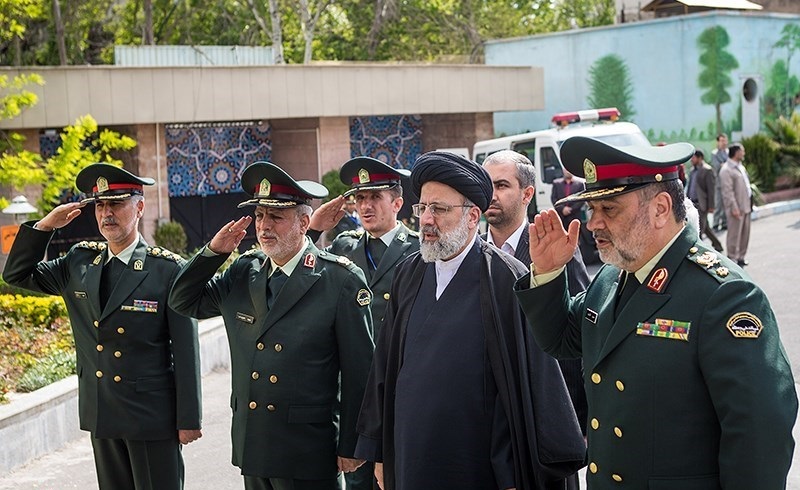 În Iran, preşedintele Republicii islamice, flancat de generali, pozează pe un fond butaforic de rachete.