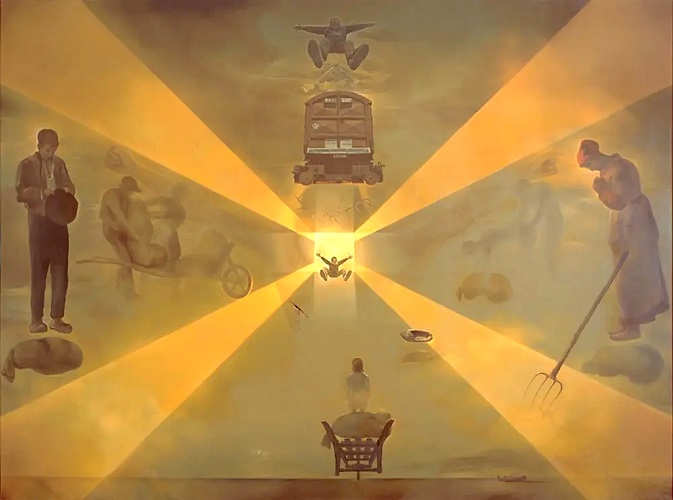 În 1965, Dalí pictează tabloul Gara din Perpignan. Pop, Op, Yes-Yes Pompier, ultima sa compoziție monumentală (3 x 4 metri) care avea să fie achiziționată în 1978 de colecționarul Peter Ludwig pentru muzeul din Köln care îi poartă numele. Tabloul reprezintă un „rezumat“ al viziunilor și obsesiilor lui Dalí văzute prin prisma exegezei sale „paranoia-critică“. În centrul compoziției, figura artistului plutind în aer este „emițătorul“ a patru raze de lumină care, amintind de crucea malteză, împart întreaga compoziție în alte patru segmente, două vertical și alte două orizontal. Pe axa verticală, figura văzută în raccourci a artistului este reproducerea în pictură a unei fotografii care-l reprezintă tînăr, fotografie trucată printr-un procedeu inventat de pictor și publicată în Jurnalul unui geniu. Figura este proiectată pe fundalul nebulos pe care Christos crucificat este reprezentat cu înțelesul de Salvator mundi, iar razele luminoase trimit la miracolul revelației divine evocat în tablou. De jos în sus, un tors feminin văzut din spate, reprezentînd-o pe Gala, este așezat pe un sac plasat într-o roabă. Deasupra ei, artistul plutind în aer proiectat pe imaginea din fundal, Christos încoronat cu spini. Mai sus, un vagon de tren destinat transporturilor și „apoteoza“ artistului reprezentat pentru a doua oară. „Triada“ Gala, Christos crucificat și dubla figură a artistului plutind în aer este întreruptă de imaginea minuțios elaborată a vagonului de marfă în josul căreia o rană sîngerîndă și un sabot din lemn ocupă partea centrală a tabloului. Vagonul de marfă este mijlocul de transport prin care, de-a lungul anilor, cuplul trimite către „cele patru colțuri ale lumii“ tablourile achiziționate de diverși colecționari prin intermediul soției artistului. Pentru Salvador Dalí, gara din Perpignan devine „centrul lumii“, iar vagonul de marfă este în tablou emblema prosperității „firmei“ inițiate de Gala Dalí, care se ocupă de negocierea contractelor și de gestionarea averii acumulate în timp. Atmosfera „aurie“ din tablou, lumina generată de prima figură reprezentîndu-l pe artist și cele patru fascicule luminoase îndreptate către cele patru colțuri ale tabloului sînt mărturia difuzării operei dalíniene în „întreaga lume“ și recunoșterea geniului artistului „sacrificat“ pe altarul unei celebrități prin care calitățile sale picturale și scopurile comerciale sînt alăturate. În anii 1930, André Breton este autorul anagramei numelui artistului, Avida Dollars, și inițiatorul excluderii pictorului din grupul suprarealist. „Dublul“ reprezentării sale din tablou ar putea fi prefigurarea primului „în cădere“, sau a excluderii sale din rîndul membrilor grupului suprarealist, iar a celui de-al doilea „în ascensiune“ către nimbul recunoașterii „geniului“ în cercul nenumăraților săi admiratori. Înscenarea din tablou are ca scop glorificarea artistului ajuns la apogeul creației sale. Pe axa orizontală, în stînga și în dreapta compoziției sînt reluate personajele din tabloul L’Angélus pictat de Jean-François Millet între anii 1857 și 1859, înfățișînd o scenă cîmpenească în care un bărbat și o femeie se roagă cu privirea aplecată asupra roadelor muncii lor așezate într-un coș și într-o roabă. În tabloul Gara din Perpignan, sacii plini reprezentînd prosperitatea cuplului în primul plan sînt simboluri falice, în timp ce contururile estompate ale perechii într-un act amoros sînt poziționate într-un al doilea plan. În partea dreaptă, femeia se sprijină într-o furcă înfiptă în pămînt, în care Dalí vede „o unealtă sexuală «coborînd cu o aviditate hotărîtă pentru fertilitate». Gestul țăranului ținîndu-și pălăria în mîini e asociat cu pudoarea pe care o inspiră o erecție. Femeia, asemenea insectei numite călugăriță, confirmă legătura inextricabilă dintre Eros și Thanatos“ (Didier Ottinger, Dictionnaire de l’objet surrealiste, Gallimard, 2013). În 1938, Dalí scrie Mitul tragic al Angelus-ului lui Millet (Le mythe tragique de l’Angélus de Millet), text publicat abia în 1963, o analiză a tabloului a cărui reproducere îl atrăgea și îngrozea deopotrivă în copilărie, urmînd să devină o imagine obsesivă.