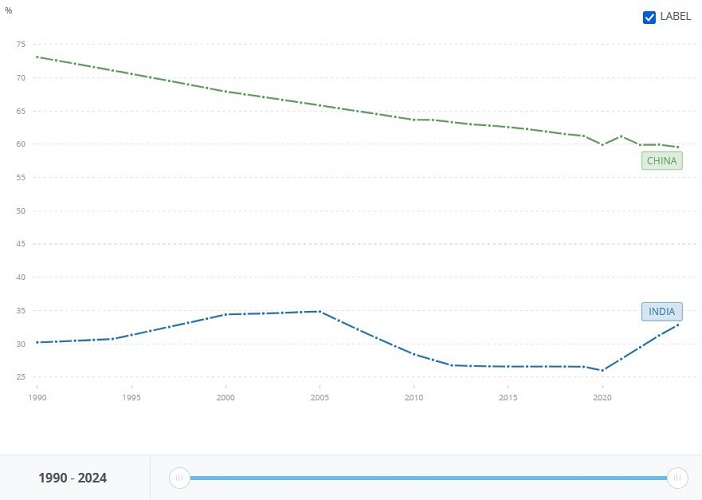 Rata de participare a femeilor la forța de muncă – India vs China (data.worldbank.org)